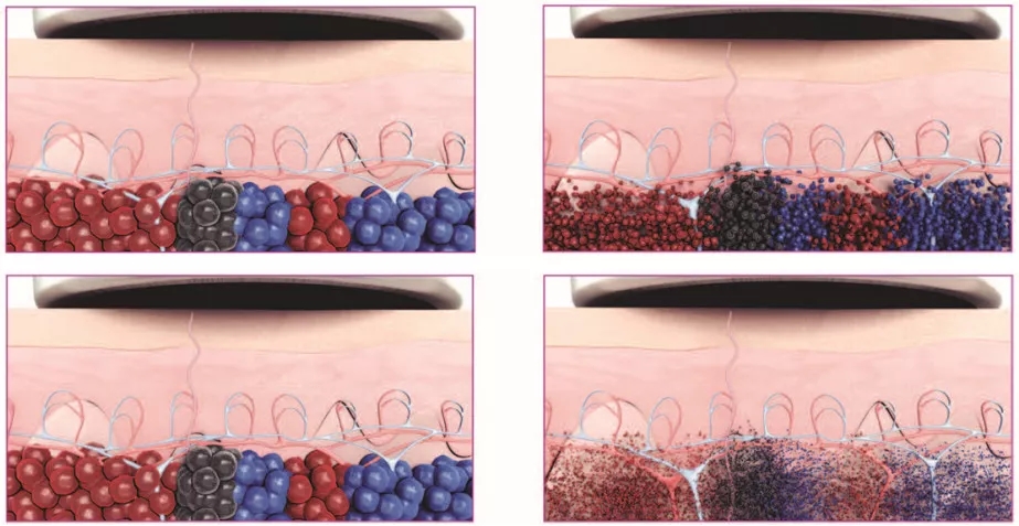 皮秒PicoSure:通过压缩超短脉宽,用较小的能量产生强烈的光机械作用,能够把色素组织和颗粒击碎成微小颗粒,可以理解为“细沙状”,以便于被吞噬细胞代谢掉。