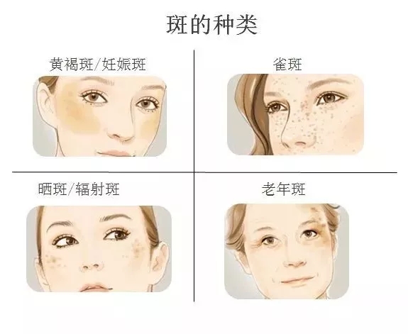 祛斑先知道自己长的是哪种斑,面部常见的的色斑有黄褐斑、雀斑、青色痣、晒斑、色沉斑等。